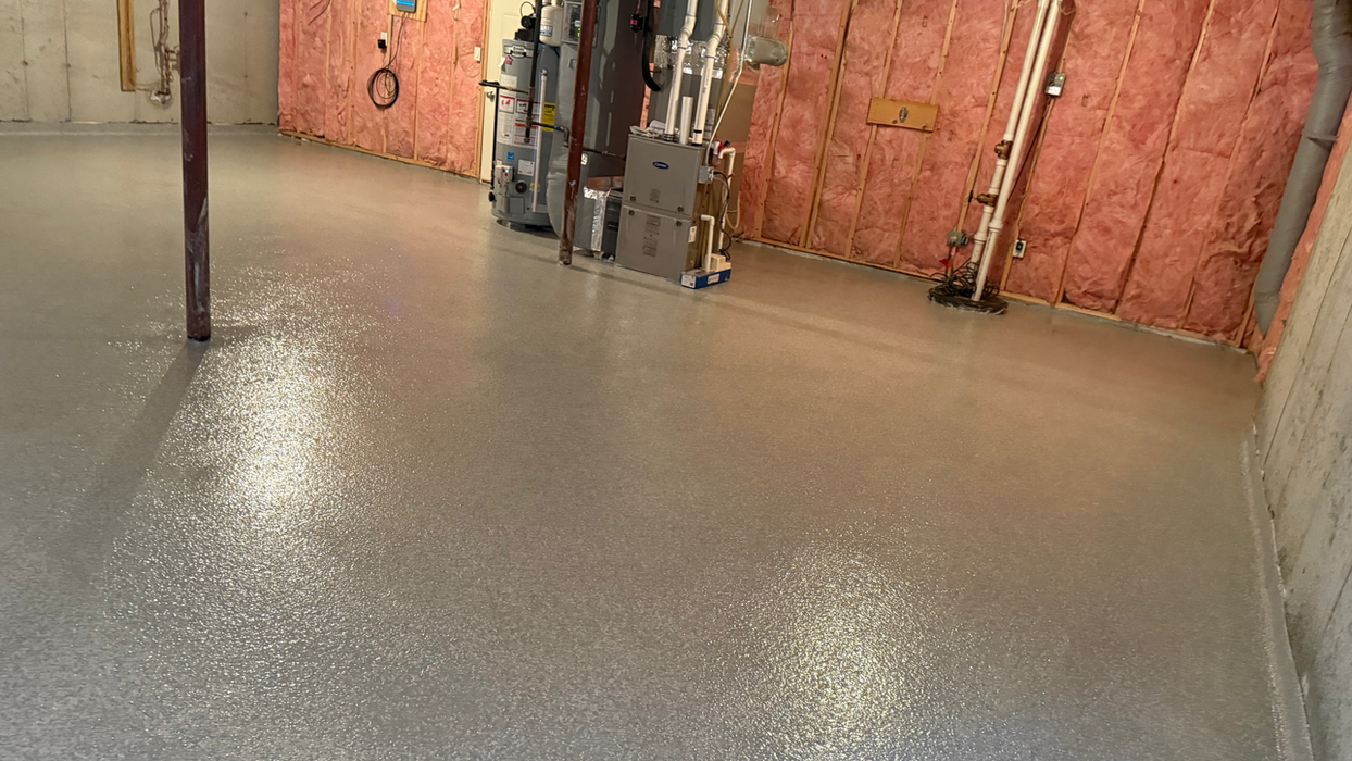 This basement floor was repaired and coated with a moisture vapor barrier epoxy system with added coves